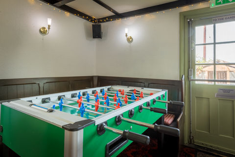 The games room is packed with entertainment, including arcade machines, a pool table, and direct access to the beer garden.